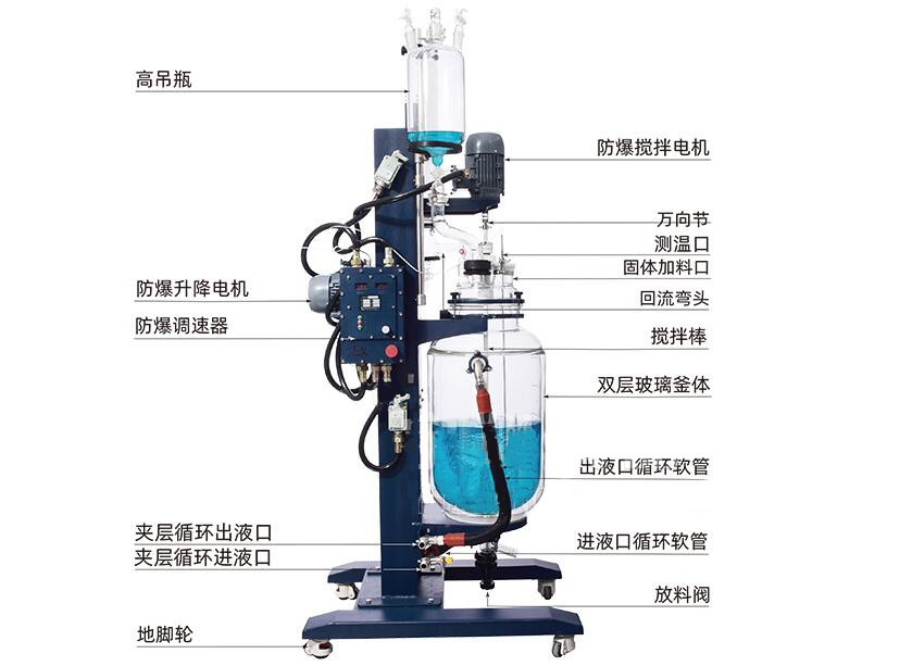本產品是在普通玻璃反應釜的基礎上,增加了自動升降功能,和釜體旋轉功能,自動升降部分是指釜蓋及其相連的攪拌系統、冷凝系統、滴加系統等釜蓋以上所有部位一起上升或下降,上升標準為攪拌棒底部離開釜體上法蘭口平面5CM以上,下降標準為釜蓋與釜體上法蘭口重新閉合。旋轉是指釜蓋及以上部件升起后,釜體可向左手動旋轉160度左右,方便直接倒料、清洗。升降玻璃反應釜可定做單層、雙層及三層玻璃釜。