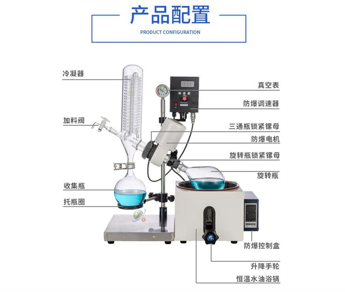 此外,旋轉蒸發器還可能包括其他輔助部件,如升降手柄、控制面板、加料閥等,以確保設備的穩定運行和操作的便捷性。這些部件共同協作,使旋轉蒸發器成為一種高效、可靠的蒸發設備,廣泛應用于化學、化工、生物醫藥等領域。